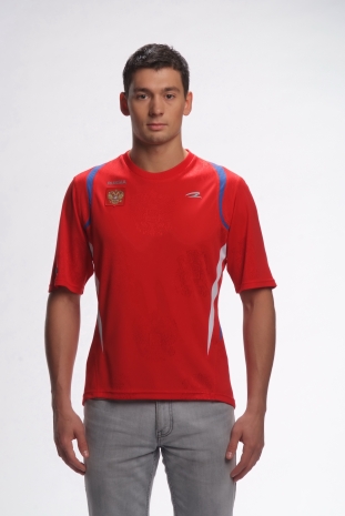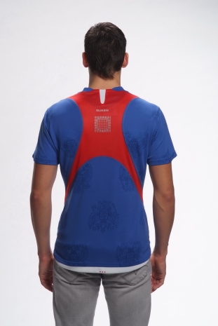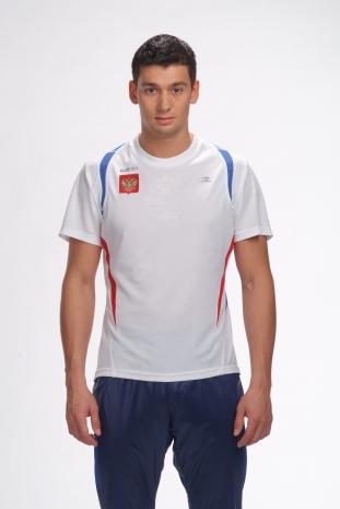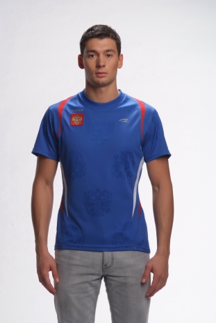 Яркая футболка комбинированного кроя с контрастными вставками двух цветов изготовлена из текстурированной ткани (жаккарда) с узором герба России. Легкий материал с мягким мерцанием произведен на одной из ведущих фабрик в Италии. Футболка дышит, подобно второй коже, прекрасно впитывает влагу и предотвращает перегрев во время занятий спортом или при повседневной носке.