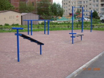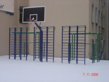 Брусья, лабиринты, шведские стенки, рукоходы, перекладины, скамьи для пресса, баскетбольные стойки, бревно гимнастическое, скамейки, урны.